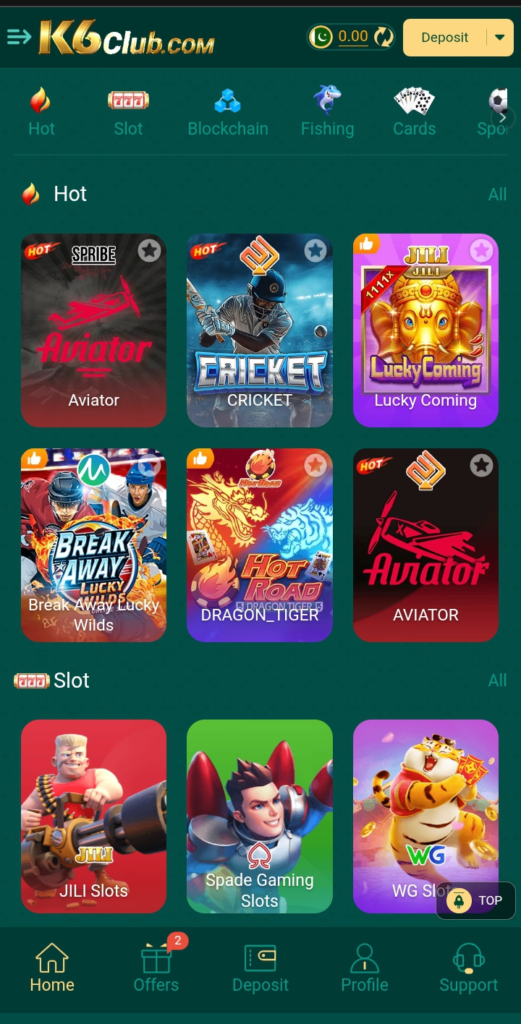 K6 Game hosts a wide range of games, including poker, roulette, slots, and skill based challenges. Players can enjoy card games like poker and baccarat alongside prediction or arcade-style games. Furthermore, the live casino section enhances thrill with real time gameplay and interactive sessions.
